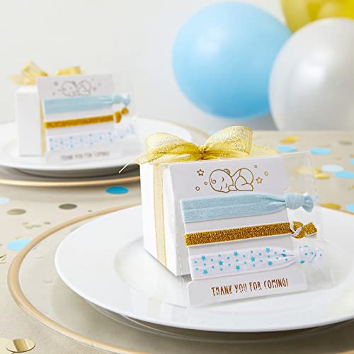 Looking for a fun and unique way to show your support at a gender reveal party, baby shower, or baptism? These high-quality hair elastics featuring gold, blue, and star designs are perfect! Each elastic is wrapped in individual packaging with a cute design and comes in two sizes. The larger size is ideal for tying up your hair, while the smaller size can double as a bracelet. Enjoy carefree styling and tangle-taming with these “ouch-less” ties! No more worrying about painful pulls or snags while updating your look. This bulk pack includes 24 individually wrapped packs with 3 elastic ties in each pack, in two sizes, 0.59 x 10 inches and 0.39 x 10 inches, and 3 styles.