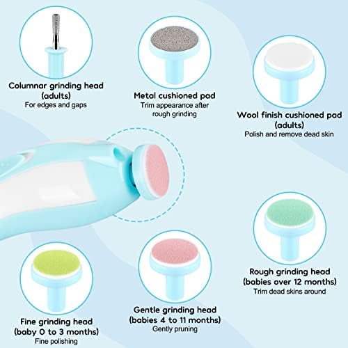 BOTH FOR BABIES AND ADULTS: The baby nail trimmer set comes with 3 colored grinding heads (blue, pink, yellow) for different age stages of babies (0-12 months and above) and others for adults, all of them are durable, so you can use them for many years.