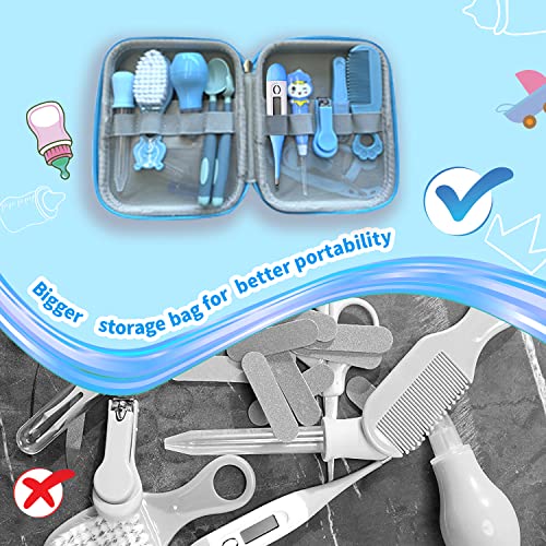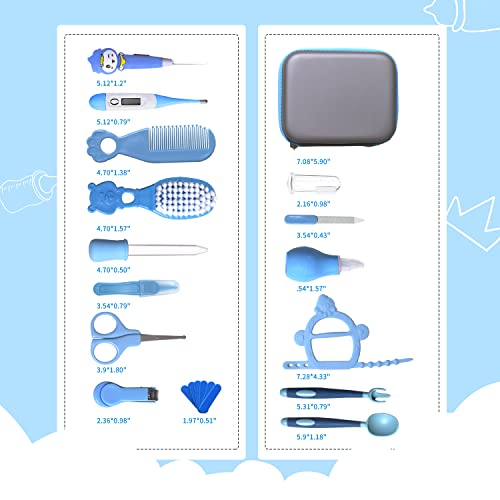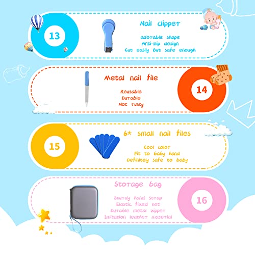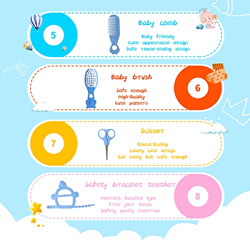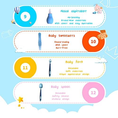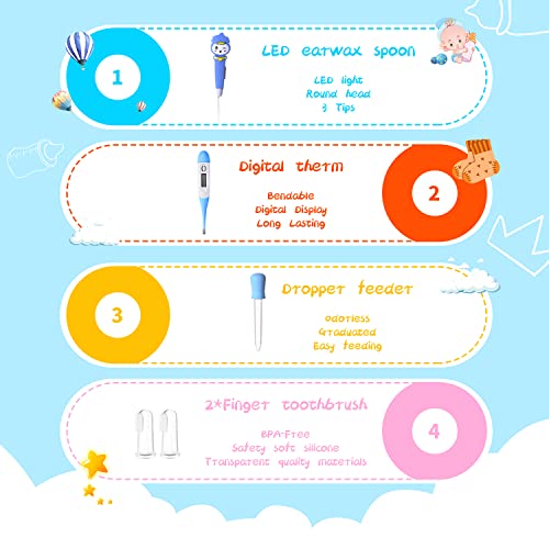 Baby care design: All components of baby grooming kit newborn boy are designed for the safety of children. Such as the round ending design with non-sharp edges; bendable therm, spoon, and fork; LED light-emitting earwax spoon, bracelet teether without falling, super soft finger toothbrush, etc.