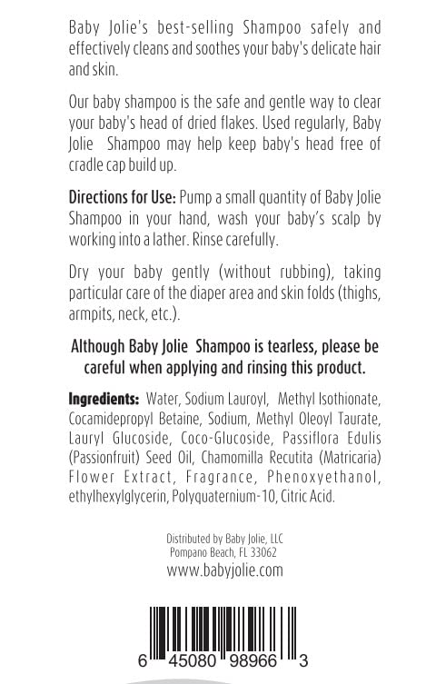 Baby Jolie Shampoo goes above & beyond mildness to help replenishing the essential moisture and nutrients that baby’s scalp may lose during bathtime. With its Tear-free baby formula, it cleanses without stripping the natural oils of the scalp of your little one.The results are soft, shinny and healthy looking hair. It’s safe and gentle composition removes dead cells, and when used regularly, Baby Jolie Shampoo may also help avoiding cradle cap build up. Our easy to rinse formula makes bath time a fun-non messy experience for mommies and babies. Tear Less: Gentle on your babies eyes. Balanced Formula: Removes dead cells without compromising the moisture of the scalp. Treats: It treats and prevent Cradle Cap build up, commonly present on newborn’s scalp Hypoallergenic: Specially formulated to minimize the risk of allergic reactions. Paraben and Phthalate Free.Tested under pediatric and dermatological control. Directions: Pump a small quantity of Baby Jolie Shampoo on your hand. Apply on your baby’s scalp working into a lather. Rinse carefully. Although Baby Jolie Shampoo is tearless, avoid eyes and mouth area.