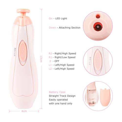 6 Grinding Heads – Electric baby nail file come with 3 cushion sandpaper safe for different stages of babies’ growth and various needs, other 3 attachments for adult use. Electric nail file also comes with 1 white soft grinding heads for baby and adult nail polishing, 1 cylindrical grinding head and 1 metal grinding head for adults. So the manicure set can be used for newborn, infant, toddlers, kids from 0 to 12 months or above. as well as adults.