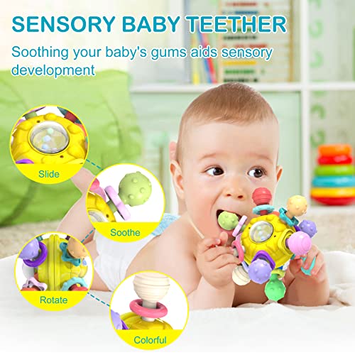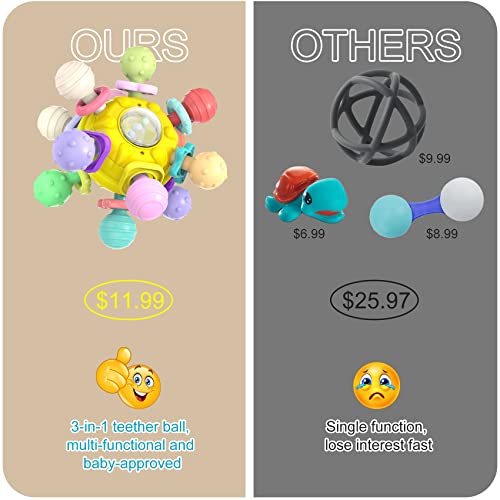 [Baby Teether Toys Enlighten Visual, Tactile, Auditory Stimulation]: Babies are instantly drawn to the 12 kinds of brightly colored balls. The multi-sensory grip rattle and teether encourage grasping and reaching which are important in gross motor skills development, with a rattle ring that slides back and forth to produce a soft rattling sound