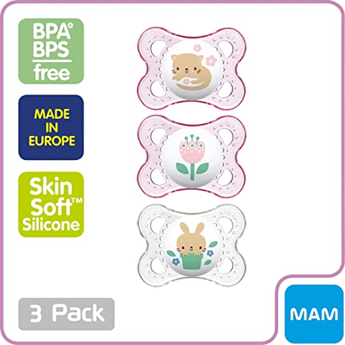 SILICONE PACIFIER – The BPA-free silicone nipple has the signature MAM breastfeed pacifier design, with silky SkinSoft material and a symmetrical shape that’s ideal for jaw and teeth development.