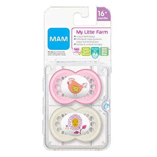 PRODUCT DETAILS – MAM My Little Farm Pacifiers, 2 Pack, 16+ Months Pacifiers, Girl, Baby Pacifier Case, Includes 1 Sterilizing Pacifier Holder Case