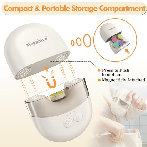 【Magneticly-Attached Storage Compartment】Megainvo baby nail filer features a press-to-push-in and out storage box that is magneticly attached to the main body as one and stores all replacement heads in one place, compact and portable to easily carry baby nail kit wherever you go. With 6 replacement grinding heads included, our newborn nail trimmer is a versatile kit catering to the different stages of your baby’s growth, providing a comprehensive solution from newborns to infants and toddlers.