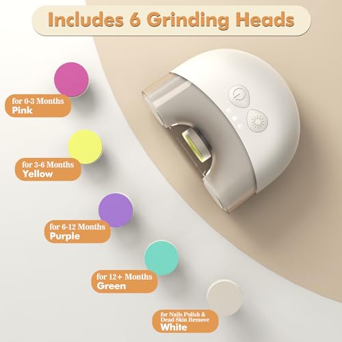 Megainvo baby nail kit includes 6pcs different grinding heads for different stage of baby’s ages and growth, suitable for 0 ~ 12+ month newborns, infants and toddlers.The intuitive color-coded replacement heads design enables you to quick identify appropriate grinding head based on your baby’s age. Easily Switchable Speed Modes with 360° Rotation