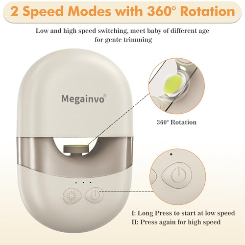 Megainvo baby nail clipper offers two motor rotation speed: slow and fast, easily switchable with the power buttom, allowing you to choose a suitable speed depending on the age of the baby.The grinding head would auto stop with firm pressure to avoid any potential harm to your baby’s fragile skins.