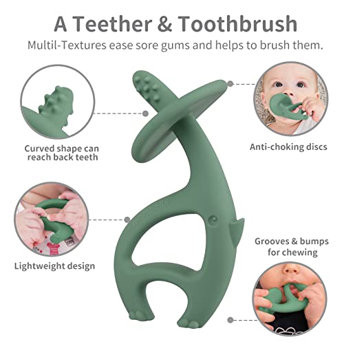 A GUM MASSAGE BABY TEETHER & A TOOTHBRUSH- Different surface textures can massage baby’s sore gums and help with teething pain relief. If you want to provide additional relief to your baby, you can keep it in the freezer. The super soft bristles on the nose help with tongue and gum cleaning. Can be used as a teething toothbrush as well. Really brings teething and brushing together in 1 product.