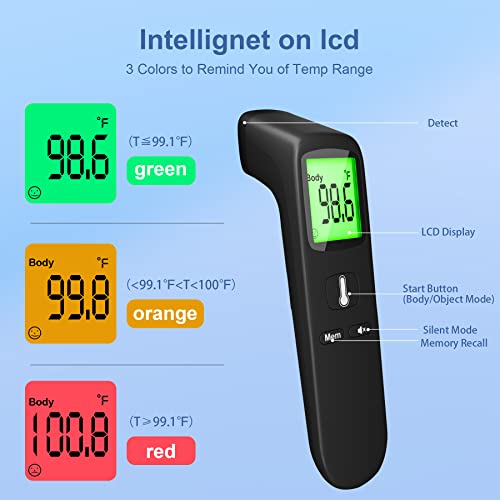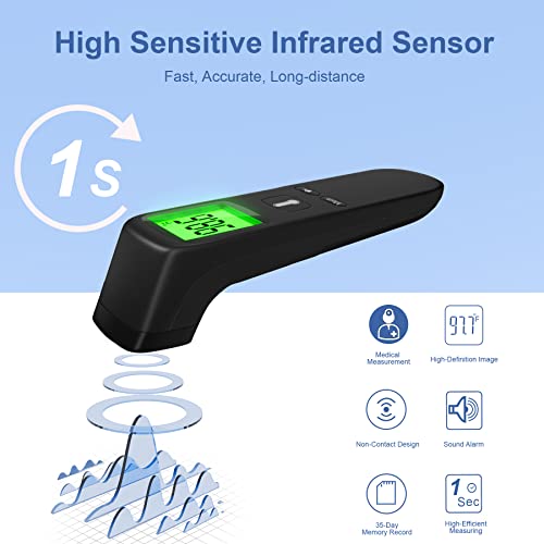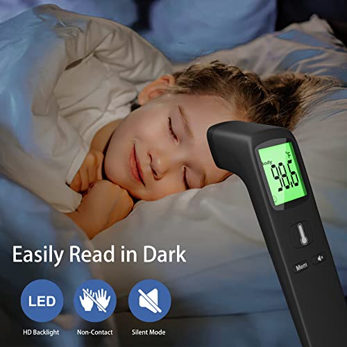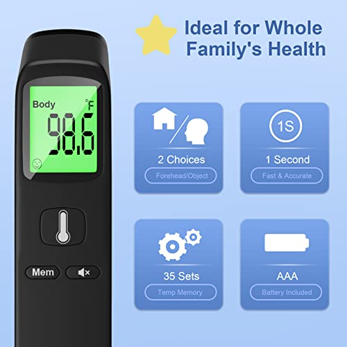 All Helpful Functions: Features fever alarm, temp memory, HD backlight and silent mode. Our digital infrared thermometer stores up to 35 previous temp readings. The backlight plus with big font makes it easy to see in the dark. Also can mute it when don’t want to wake the sleeping child. Ideal for tracking family member’s temp.