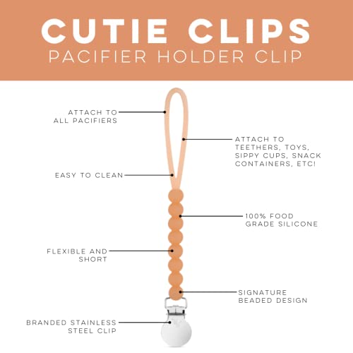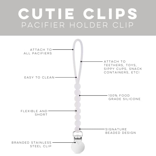 PURPOSE: Teether + Clip STYLE: Silicone LENGTH: 7″ MATERIALS: 100% food grade silicone and a lead free stainless steel Ryan & Rose clip. CAUTION: Attachment loop is not for teething. Cutie Clips are tested, safe, and certified. All Cutie Clips and their materials are non-toxic and are free of lead, latex, phthalates and BPA. ATTACH: Pacifiers, teethers, sippy cups, snack containers, toys, blankets, etc. to clothing, car seats, strollers, high chairs, and everything in between. DIRECTIONS: Thread the loop through the item of your choosing, then feed the metal clip through the loop and pull tight. CLEANING: All Cutie Clips (excluding leather) can be hand washed/spot cleaned with warm water and mild soap. Absorb excess water with a towel and dry off metal clip. Let the Cutie Clip air-dry, with the metal clip open. CAUTION: This is not a toy. To avoid a choking hazard, inspect before each use. Discard immediately if signs of damage. Do not use without adult supervision. Do not tie around a child’s neck and never allow a child to use while sleeping. Does contain small parts. Do not microwave, boil, or sterilize. We recommend replacing Cutie Clips after 2 months of continued use.