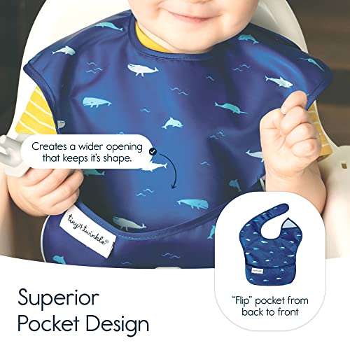 BABY ESSENTIALS MUST HAVES: Few items are more crucial in your baby feeding supplies pack than food bibs – Tiny Twinkle is proud to offer you a waterproof bib made with soft, lightweight, water-repellent fabric from recycled polyester that is treated with a special waterproof back coating. Moreover, our food catching bib features a bottom pocket designed to stay open to catch spills!